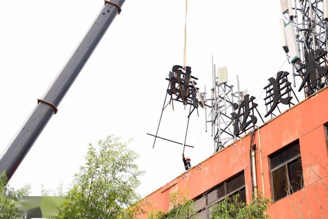正在景阳道与济南道交汇处,新疆乌鲁木齐高炮广告图片,专业职员正正在运用大型吊机及气割配置对楼顶广告方法举行拆除